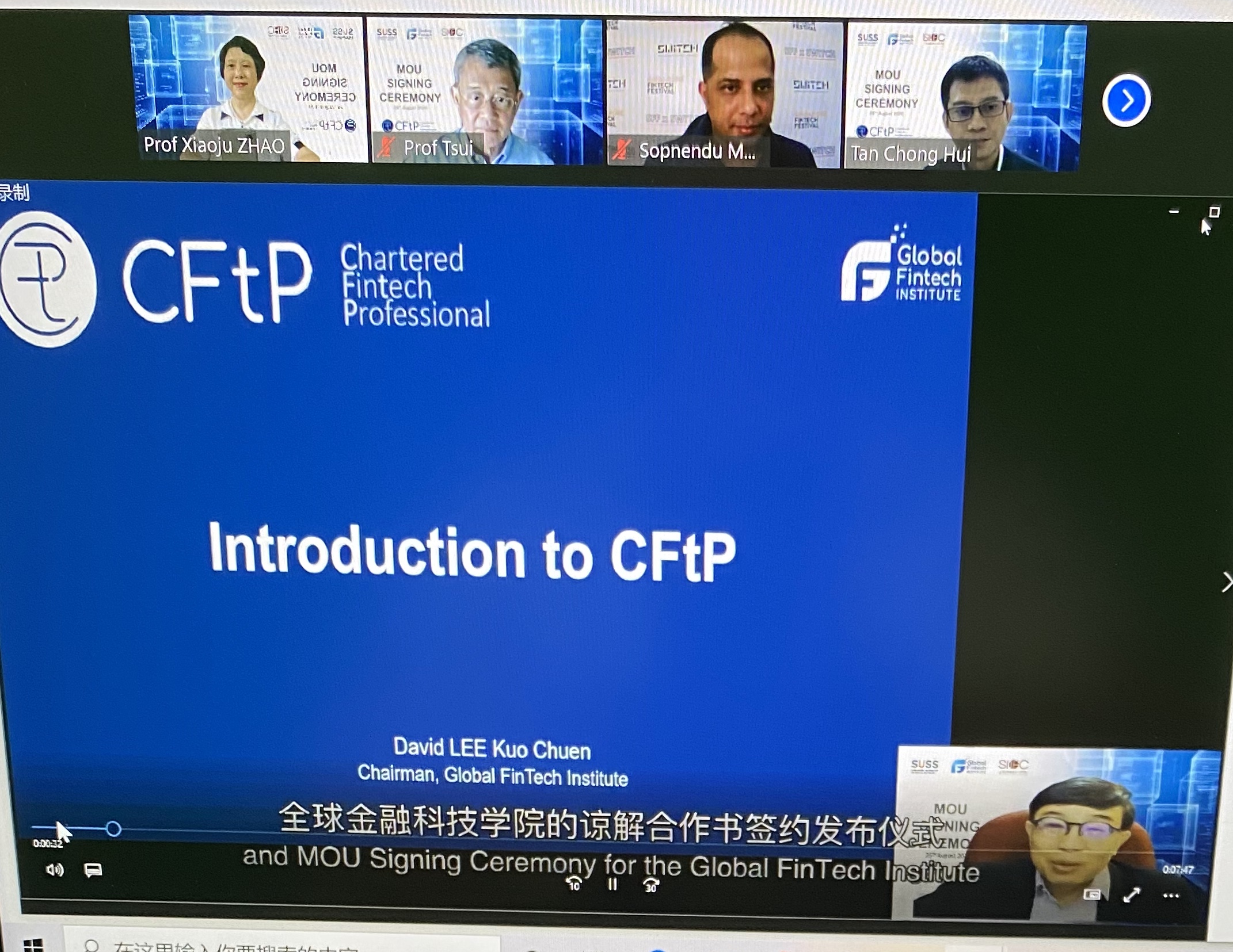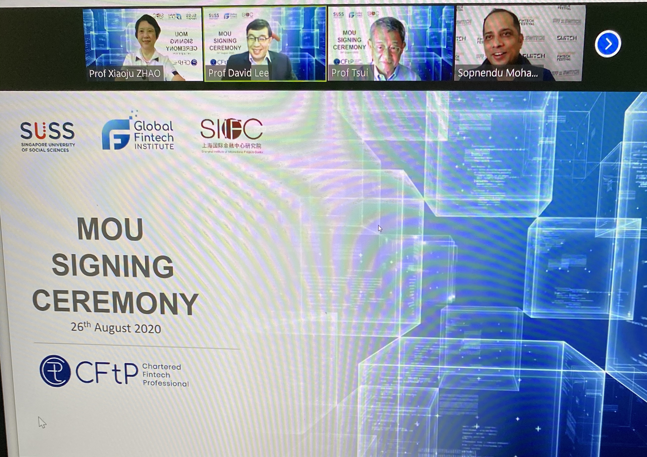 The Signing ceremony of the Memorandum of Understanding (MOU) between Global FinTech Institute (GFI), Shanghai Institute of the International Finance Center (SIIFC) and Singapore University of Social Science (SUSS) was held successfully