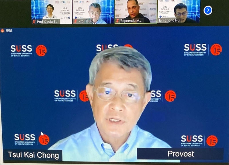 The signing ceremony was host by Dr Tan Chong Hui, Head of Finance Programme of School of Business at SUSS, Professor David Lee, Co-founder and chairman of GFI, Professor Tsui Kai Chong, Provost of SUSS, Professor Zhao Xiaoju, Dean of SIIFC, Mr Sopnendu Mohanty, Chief FinTech Officer of the Monetary Authority of Singapore (MAS) make speeches at the ceremony.
