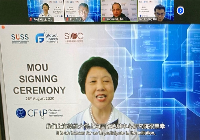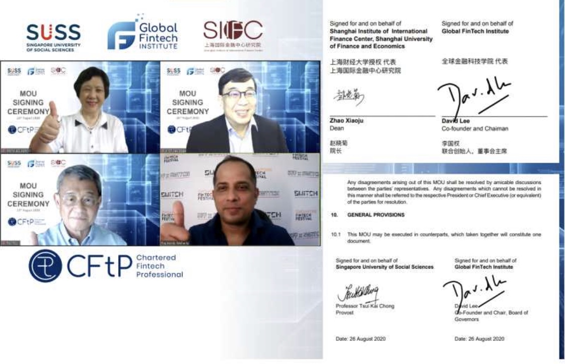 On 26 August 2020, Global FinTech Institute (GFI) signed a Memorandum of Understanding (MOU) online with the Singapore University of Social Science (SUSS) and the Shanghai Institute of the International Finance Center (SIIFC) of Shanghai University of Finance and Economics (SUFE), to grow FinTech professionals in Singapore and China, and build a sustainable pipeline of talents to bolster the global FinTech ecosystem. Gracing the virtual event were Professor David Lee, Co-founder and chairman of GFI, Professor Tsui Kai Chong, Provost of SUSS, Professor Zhao Xiaoju, Dean of SIIFC. The signing ceremony was also witnessed by Mr Sopnendu Mohanty, Chief FinTech Officer of the Monetary Authority of Singapore (MAS).