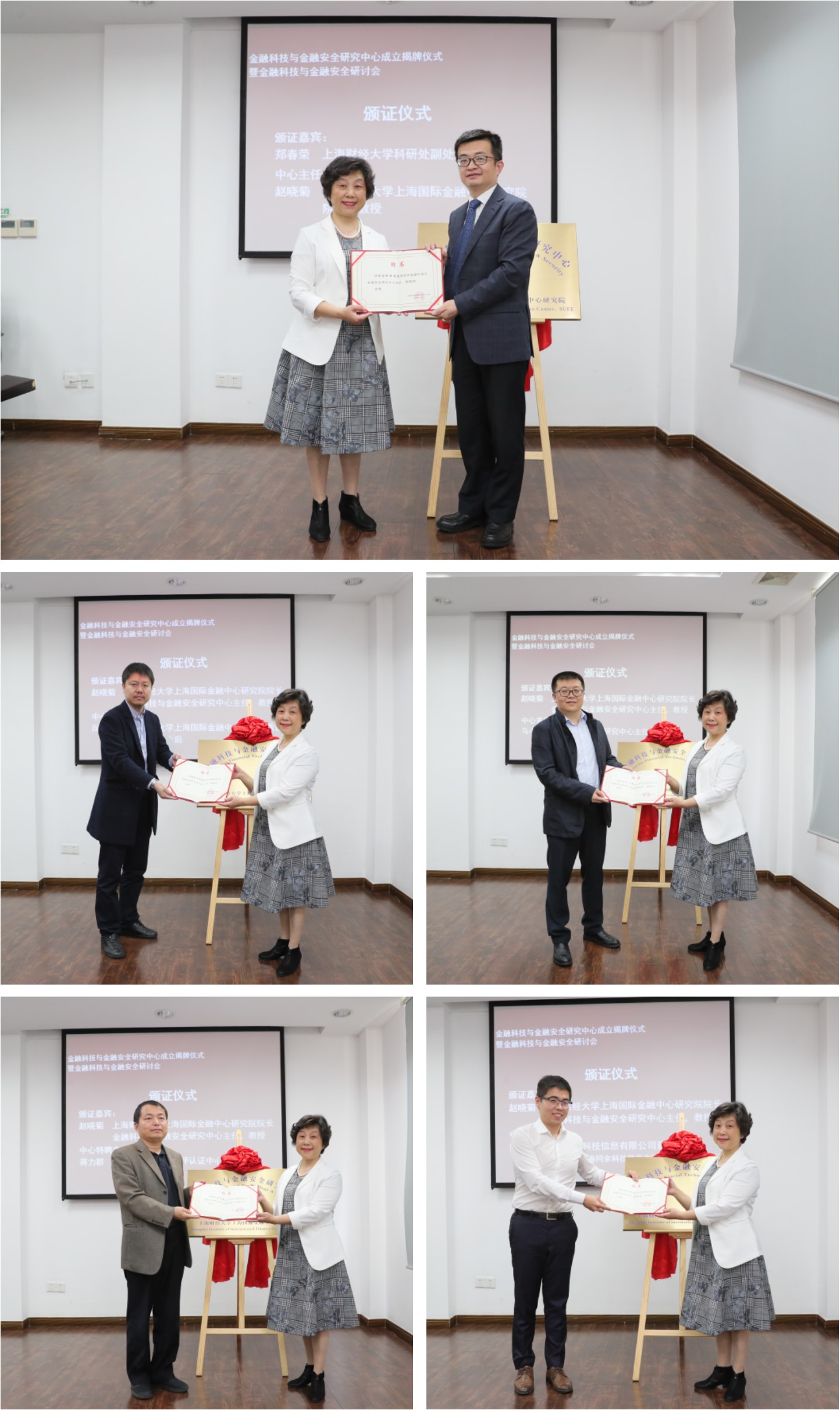 揭牌仪式结束后进入授聘环节。上海财经大学科研处副处长郑春荣教授为上海财经大学上海国际金融中心研究院院长赵晓菊教授颁发聘书,聘任赵晓菊教授为金融科技与金融安全研究中心主任;上海财经大学上海国际金融中心研究院院长、金融科技与金融安全研究中心主任赵晓菊教授为上海财经大学上海国际金融中心研究院数据库主任闵敏博士颁发证书,聘任闵敏博士为金融科技与金融安全研究中心执行主任;为上海区块链技术研究中心主任马小峰副教授颁发证书,聘任马小峰副教授为金融科技与金融安全研究中心首席特聘专家;为上海市信息安全测评认证中心主任蒋力群先生、上海同余科技信息有限公司董事长陆路先生(由上海同余科技信息有限公司CTO、合伙人邵宝麟先生代领聘书)颁发聘书,聘任蒋力群主任、陆路董事长为金融科技与金融安全研究中心特聘专家。