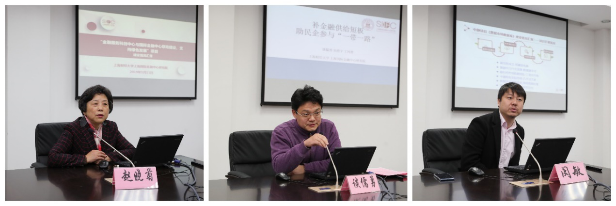 上海财经大学上海国际金融中心研究院研究院院长赵晓菊教授、副院长谈儒勇副教授,实验室主任闵敏博士后分别汇报课题项目情况