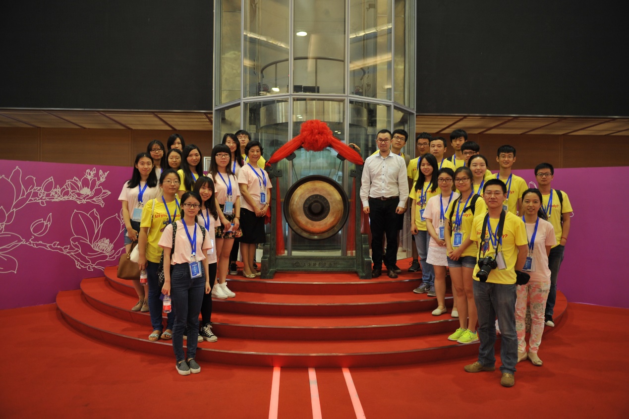 任毅襄理与夏令营的师生在上交所合影留念(锣两边分别为赵晓菊院长与任毅襄理)