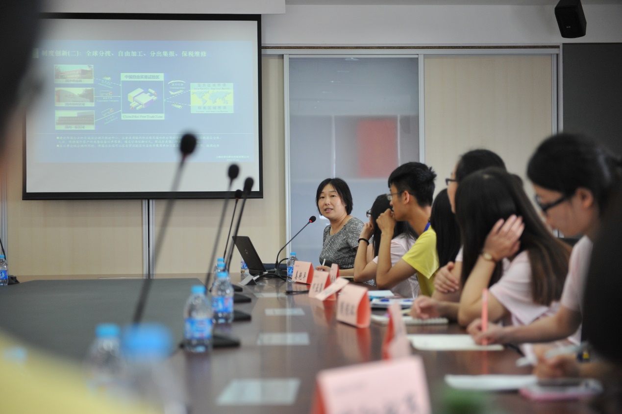 自贸区管理委员会保税区财政和金融服务处主任曹艳文向参营同学详细地介绍了自贸区的相关情况