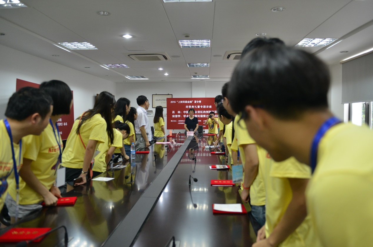 2015“上财同德夏令营”圆满地落下了帷幕。短短的四天夏令营紧扣一带一路、互联网金融、人民币国际化、自贸区四个主题,细致周到的组织安排、专家学者高水准的专题讲座、丰富多彩的考察访谈、积极热烈的小组讨论、生动活波的友好氛围令参营同学赞叹不已。参营同学纷纷表示参加本次夏令营,获得了超预期的收获。营员们纷纷表达了对专题讲座的演讲嘉宾、支持本次夏令营考察访谈的相关机构以及为组织本次夏令营而竭心尽力的赵晓菊院长、陈婷婕老师、张暄昱老师和研究院助研周边、钱叶粲、王丹的衷心感谢。营员们还在留言中表示,夏令营为他们留下美好而深刻的记忆,希望夏令营能够持续不断办下去,并预祝夏令营越办越好。