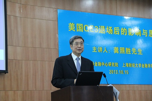 2013年10月15日下午,台湾前金融监管局主席、白羊国际投资管理公司创办人暨董事长龚照胜先生前来为我院师生作“美国QE3退场后的影响与思考”的讲座。赵晓菊教授主持讲座。龚照胜先生的讲座在同德楼一楼报告厅举行,吸引了我院硕士生、博士生踊跃参加并积极提问互动,反响十分热烈。