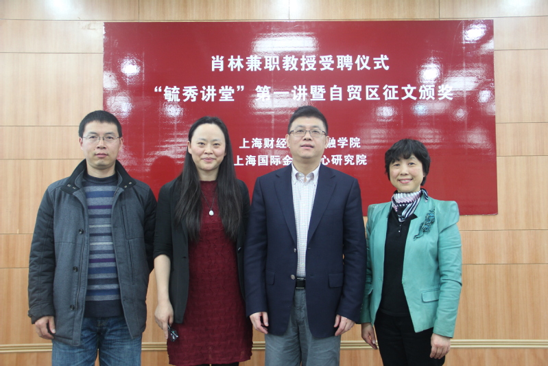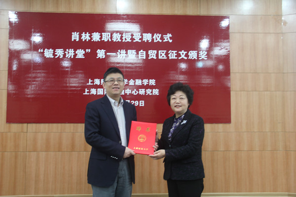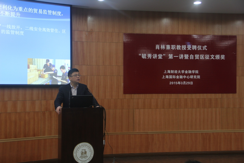 3月29日上午,上海市人民政府发展研究中心主任肖林兼职教授聘任仪式在上海财经大学同德楼一楼报告厅举行。上海财经大学校长樊丽明、上海国际金融中心研究院执行院长赵晓菊、上海财经大学金融学院常务副院长刘莉亚、上海财经大学科研处副处长魏航、上海财经大学金融学院院长助理陈利平出席聘任仪式。仪式由刘莉亚主持。自贸区征文获奖的部分同学,金融学院2013级、2014级硕士生百余人参加了活动。