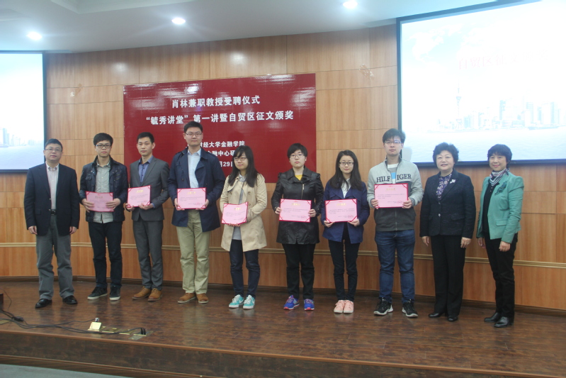 肖林教授以“中国(上海)自由贸易试验区发展及展望”为题作“毓秀讲堂”第一讲,从中国上海自贸区四大制度创新、四大改革成效、最新进展、内外资企业的认可及进一步深化改革开放等五个方面全面剖析了中国推进自贸区重大战略举措及下阶段的重要任务,并热情的回答了同学们积极踊跃的提问。讲座结束后,自贸区征文获奖同学代表为师生做了论文相关精彩报告。