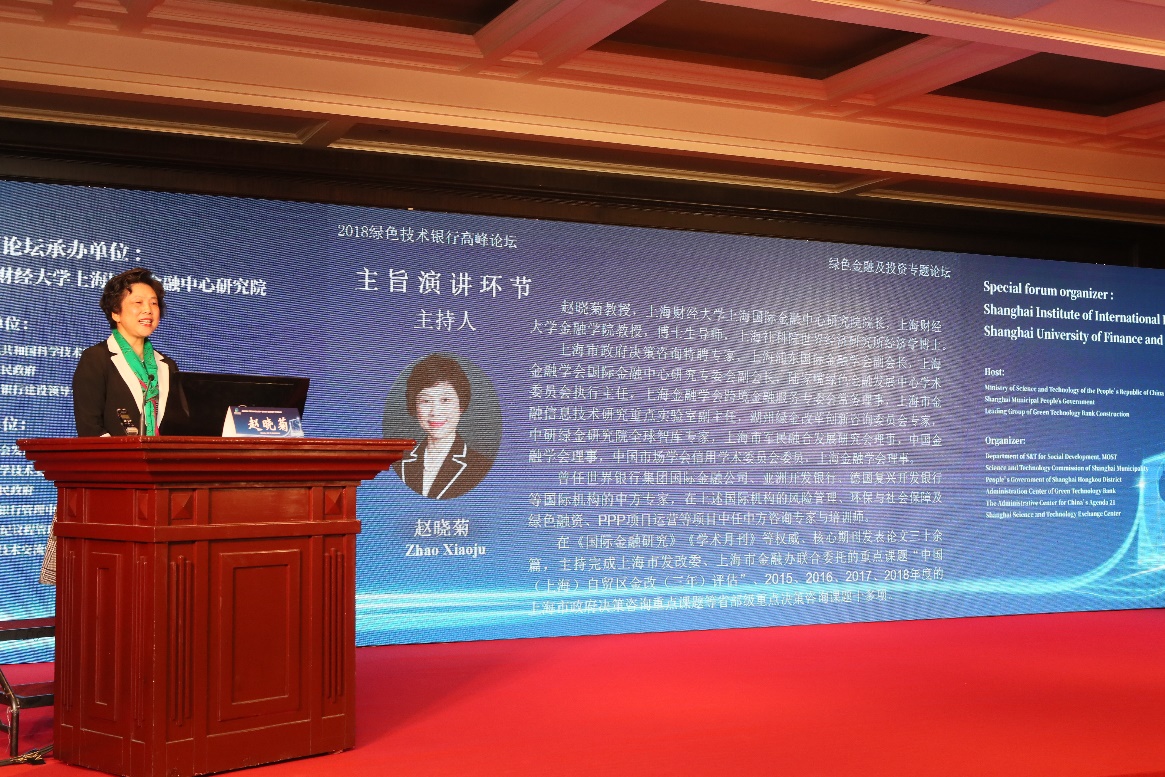 致辞结束后论坛进入主旨演讲环节,由上海财经大学上海国际金融中心研究院院长赵晓菊教授主持。上海科学技术交流中心、绿色技术银行管理中心主任王震先生,国际科技评估中心副总评估师韩军先生,国际金融论坛(IFF)副秘书长兼绿色发展中心主任孙轶颋先生,兴业银行首席经济学家鲁政委先生,上海财经大学上海国际金融中心研究院副院长马文杰副教授分别带来了精彩的主旨演讲。