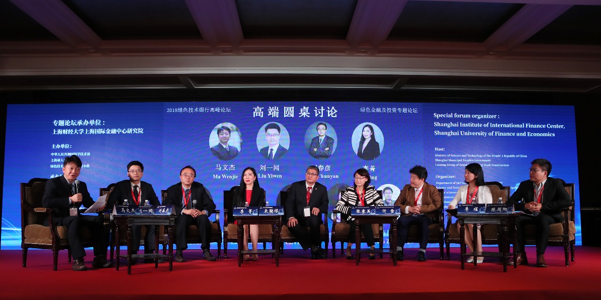 主旨演讲环节结束后即进入高端圆桌环节,由上海财经大学上海国际金融中心研究院副院长马文杰副教授主持。湖州市金融办副主任刘一闻先生、同济大学上海期货研究院院长助理刘春彦教授、安永气候变化与可持续发展服务大中华区绿色金融业务总监李菁女士、江苏开鑫绿色金融有限公司董事长束蘭根先生、上海双创投资中心总经理张赛美女士、上海创能国瑞能源互联网技术有限公司联合创始人忻雷先生、上海环境能源交易所总经理助理李瑾女士、浙江大学互联网金融研究院副研究员陈周阳先生分别围绕“促进绿色技术的增值、转化需要什么样的绿色金融体系”主题发表观点并进行讨论。