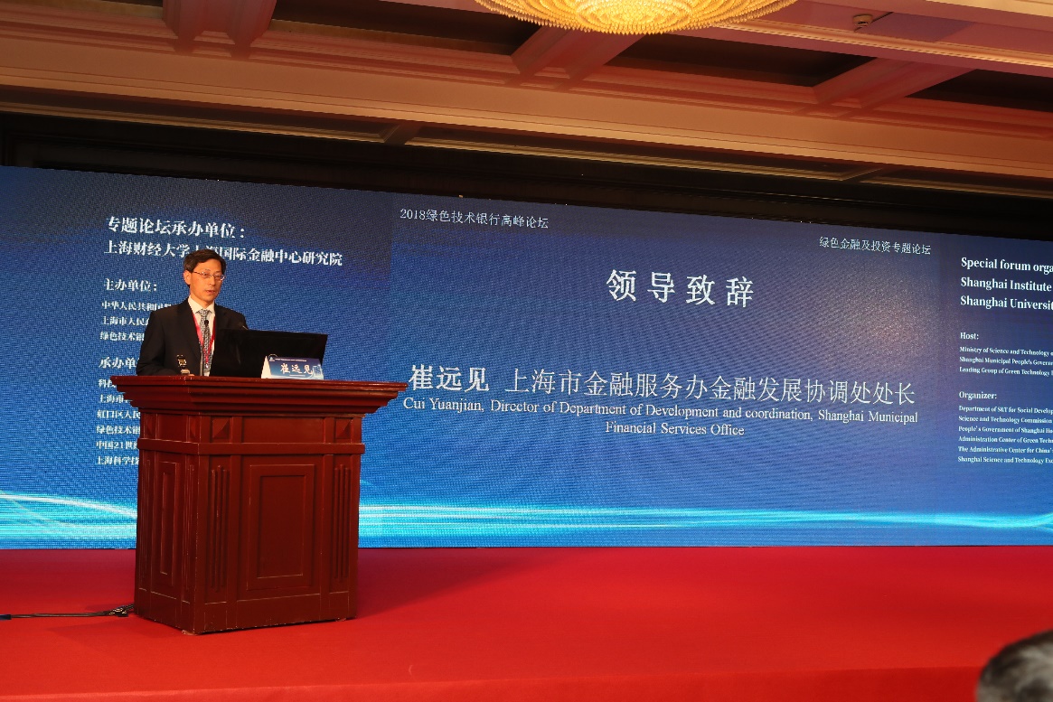 上海市金融服务办公室金融发展协调处处长崔远见先生在致辞中简要介绍了上海在绿色金融业务方面取得的积极进展:在绿色信贷方面,上海在节能环保相关领域信贷余额增长幅度较大,高于同期各项贷款的增幅;在绿色债券方面,2017年中国绿色债券主要通过上海的债券市场进行发行,发行量达到370亿美元,同比增长4.5%,占全球总规模的22%;在碳金融方面,2017年上海碳市场交易量更是位居全国首位。
